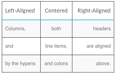 | Left-Aligned | Centered | Right-Aligned | | ---------------- |:-------------:| -----------------:| | Columns, | both | headers | | and | line items, | are aligned | | by the hyphens | and colons | above. | | ![]() |